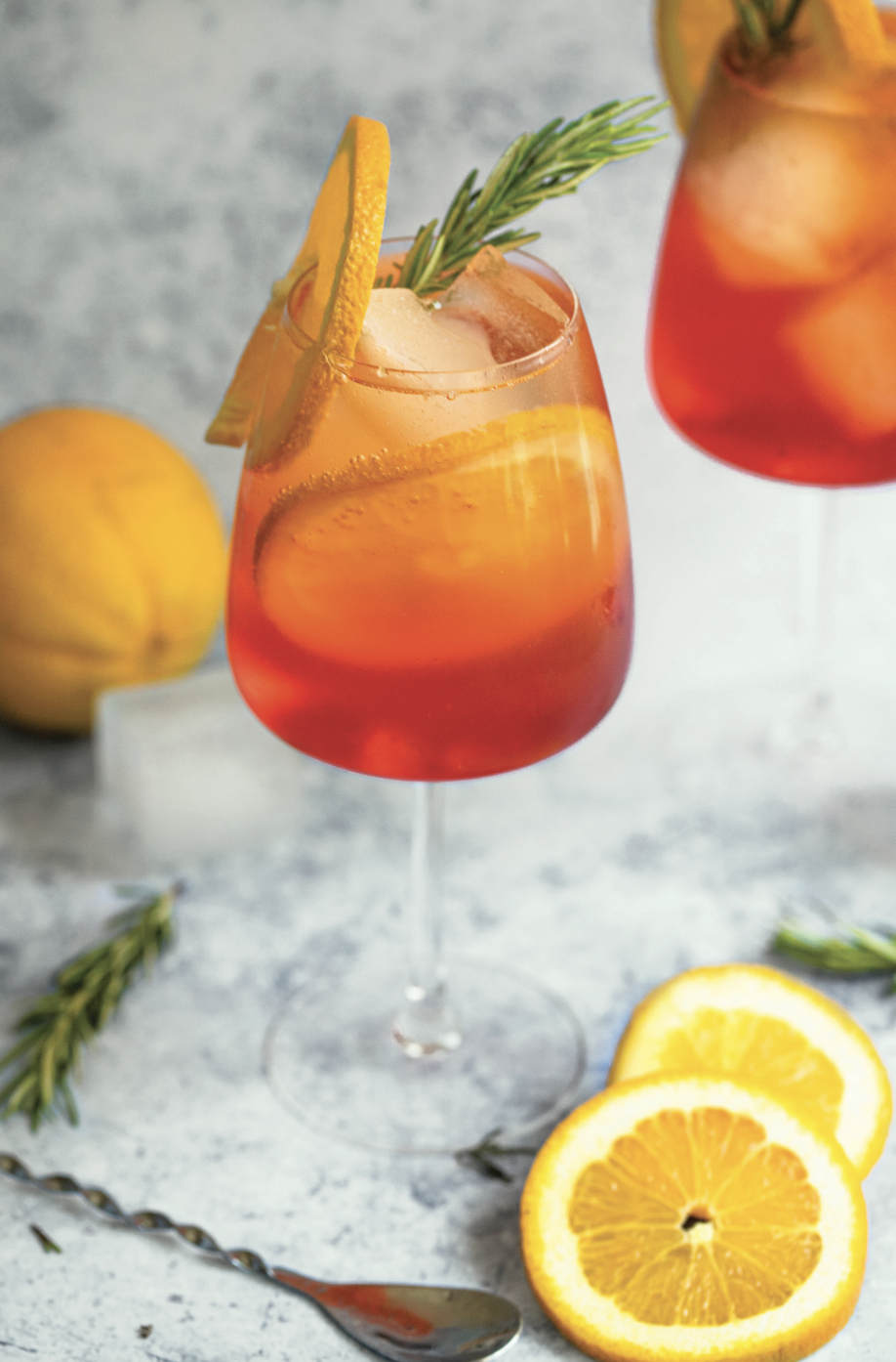 3. Pour half into each glass, then garnish with orange slices and rosemary sprigs before topping with more sparkling water and serving!